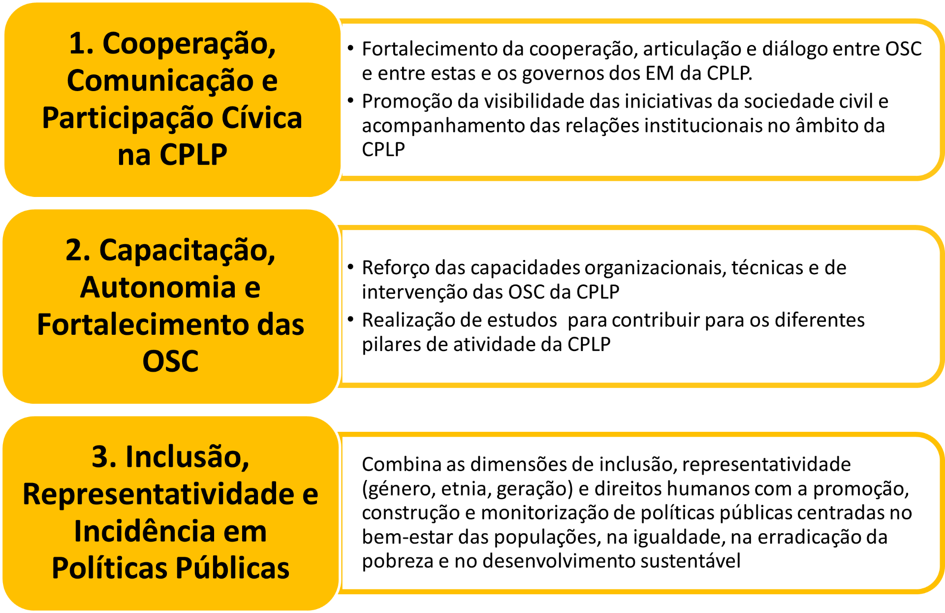 Os membros do FSC-CPLP comprometem-se a apoiar o STP na representação eficaz da sociedade civil, promovendo a mobilização de recursos, a formulação de políticas e a implementação de projetos que reforcem a inclusão social, a igualdade, os direitos humanos, o bem-estar das populações, a erradicação da pobreza e o desenvolvimento sustentável.